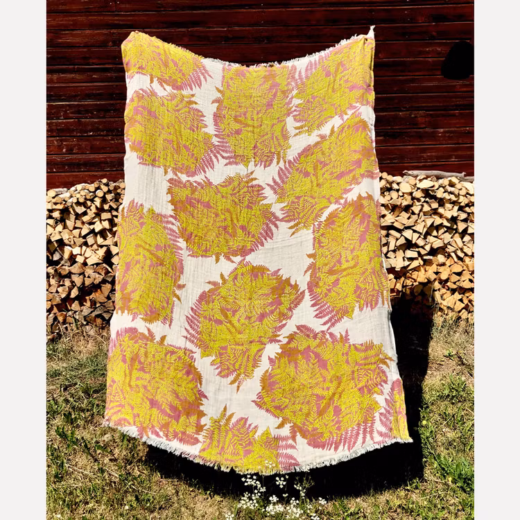 Varje pläd printas för hand och blir därmed en unik produkt. Den printade sidans bakgrundsfärg, är oblekt lin och baksidan är ljus petrol-blå.